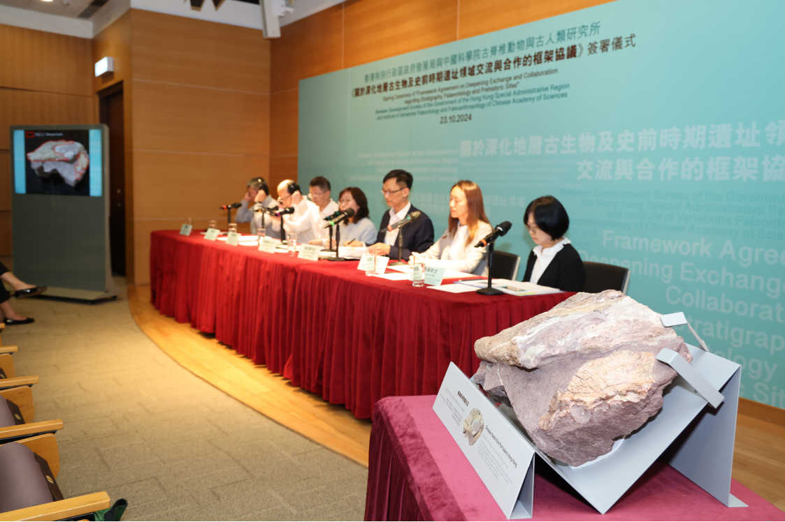 签约仪式后双方共同发布在香港东北部水域赤洲岛白垩纪恐龙化石的最新发现。本次发现不仅填补了香港恐龙发现的空白,更为研究我国华南地区恐龙的演化历史和古地理分布提供了重要线索,引起了媒体的广泛持续报道。