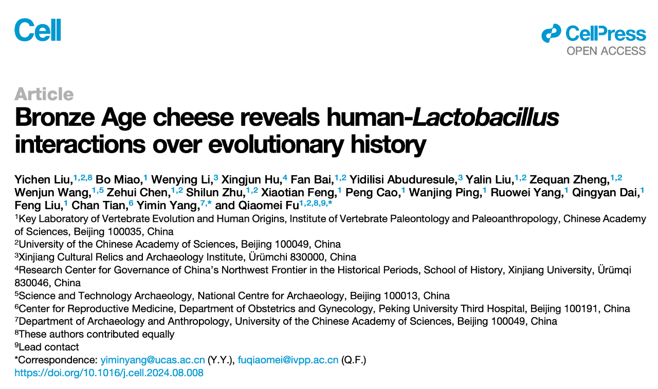近日,《Cell》期刊发布2024年度最佳研究论文,我所付巧妹团队研究成果“世界首个青铜时代奶制品揭示人类与乳酸菌相互作用史”入选。团队历经十一年自主研发捕获探针,从世界最古老的奶酪中获得距今3,500年的高质量开菲尔乳酸菌基因组,实现国际首个古代发酵微生物的全基因组研究。