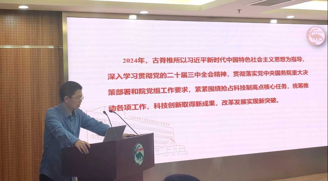 会议总结了2024年研究所各项工作取得的成绩。党委书记、副所长刘俊代表所领导班子作研究所2024年度工作报告。2024年,古脊椎所坚持以习近平新时代中国特色社会主义思想为指导,学习贯彻习近平总书记对中国科学院重要指示批示精神,按照院党组统一部署,持续加强党对科技创新事业的全面领导,围绕抢占科技制高点,组织实施重大科技任务,产出突破性创新成果,持续加强人才队伍建设、平台与条件保障能力建设,上下同心,真抓实干,研究所各项工作均取得重要进展。