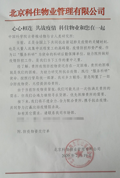 2月19日,古脊椎所收到行管局科住物业公司支援的口罩等防疫物资,为研究所安全复工、抗击疫情再助力。王秀琴副所长接受捐赠,并表示感谢。