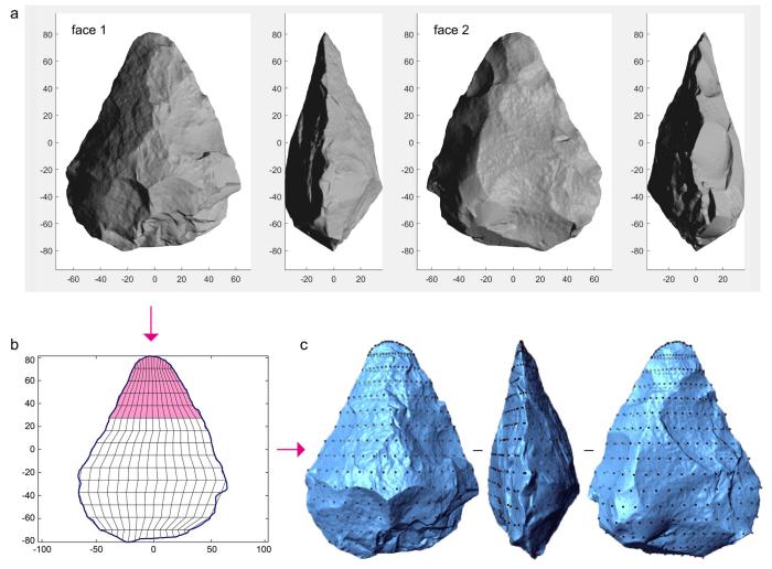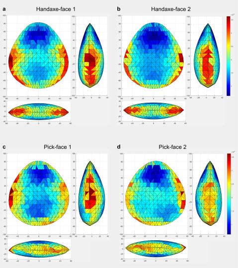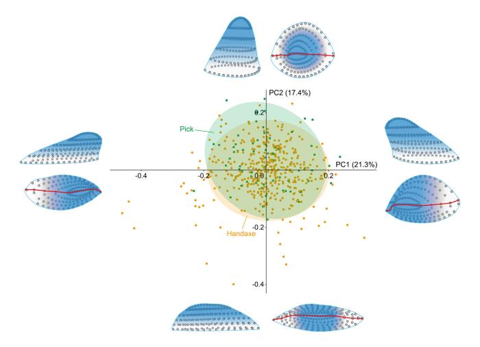 合作团队提取尖部标志点的分析进一步表明,尽管手斧和手镐的尖部顶视形态(即横截面形态)存在较大变异,但尖部平视形态普遍趋向于弧形或舌形,呈现出明显的区域性形态特色。