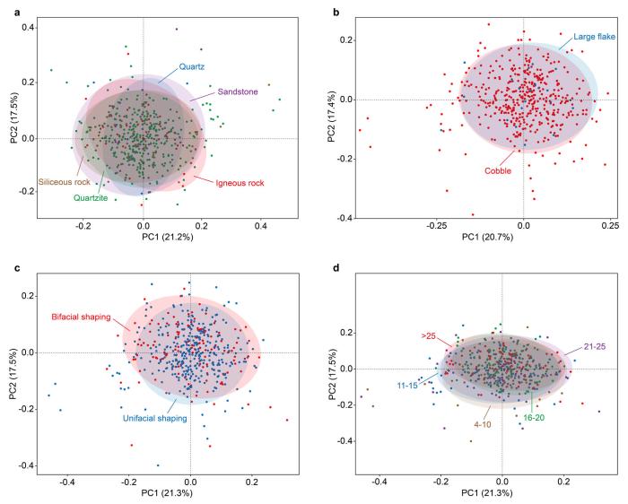 李浩分析称,结合尖部修疤的形态特点来看,弧形或舌形刃缘的形成主要受到尖部平行于器身长轴的纵向修疤的影响。而其他因素,包括原料、毛坯类型、修型模式和修型程度等,与尖部形态之间并没有显著相关性,这一点得到主成分分析和置换检验结果的验证。因此,百色盆地大型工具颇具特色的尖部形态与特殊技术策略(尖部纵向修疤)的出现紧密相关。