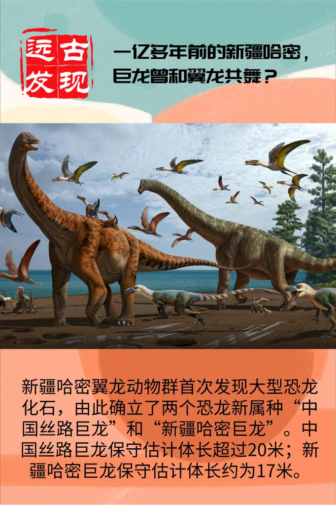 据介绍,中国丝路巨龙6节颈椎的长度约3米,保守估计其体长超过20米;新疆哈密巨龙的单个尾椎长度在210毫米至320毫米不等,保守估计体长约为17米。与中国丝路巨龙保存在一起的还有一块残破的哈密翼龙下颌,说明这些大型恐龙与哈密翼龙共同生活在约1.3亿年至1.2亿年前白垩纪的天空和陆地上。