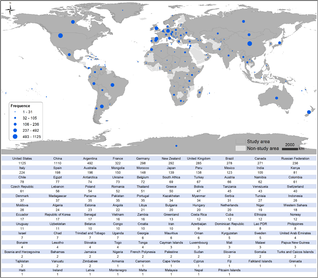近十年古脊椎动物学研究的全球热点分布:蓝色圆点大小反映各国新描述分类单元的数量。