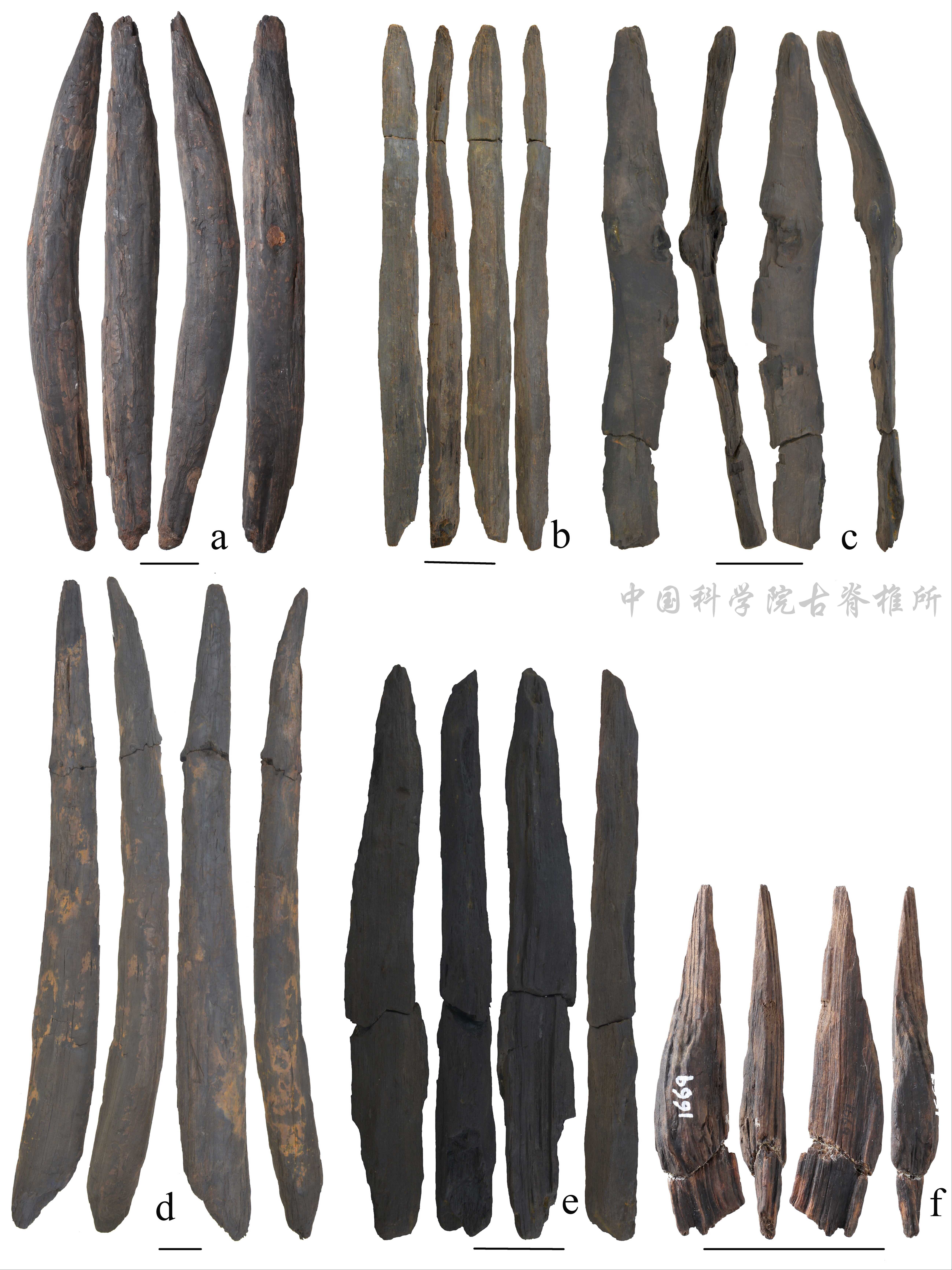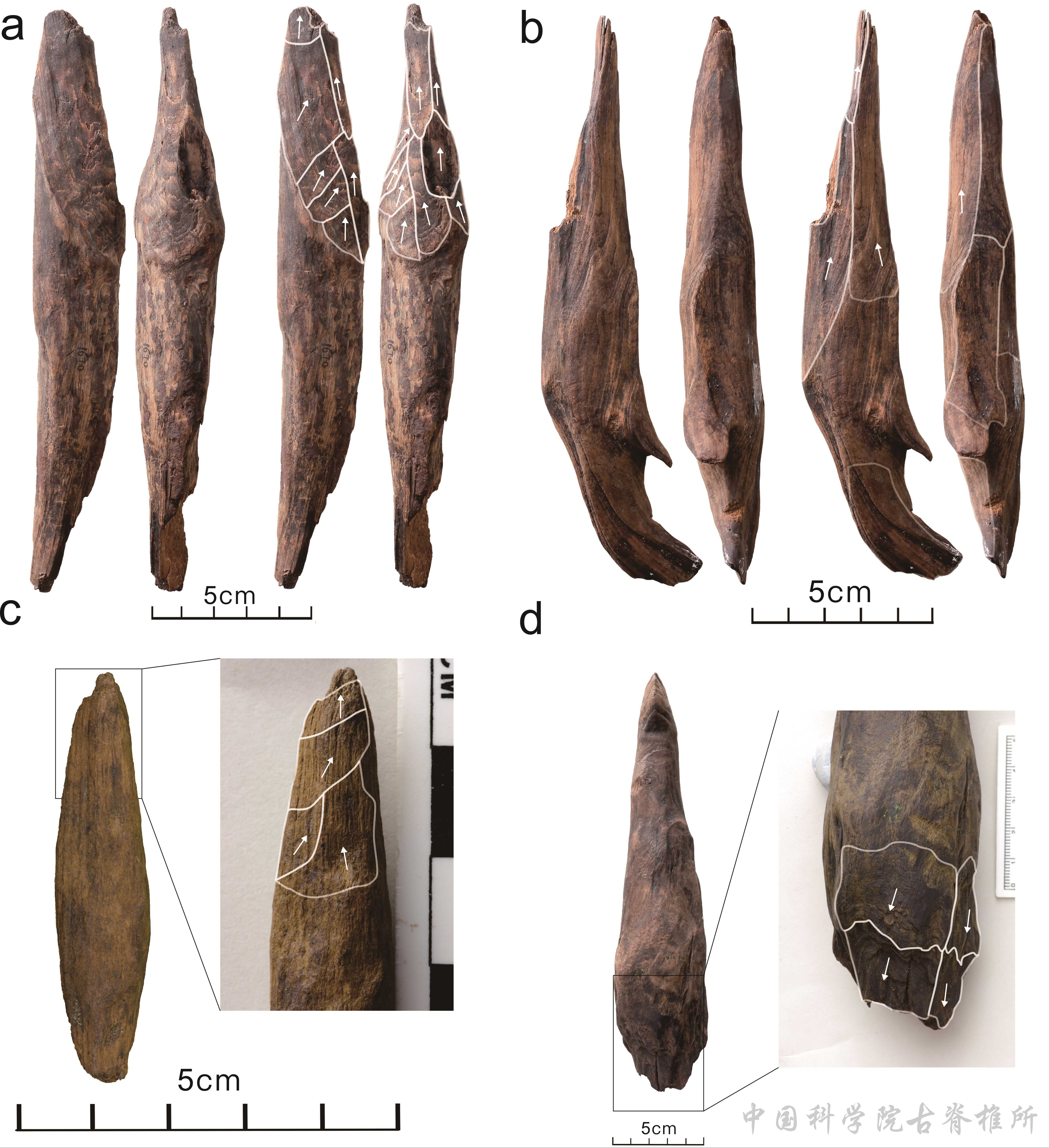 木质材料会在埋藏过程中降解,痕迹变得模糊乃至消失。为论证这些木器的人工属性及其功能,考古队开展了材质分析、痕迹分析、残留物分析和实验模拟等专项研究。木器主要用松木制作,宏观和显微观察表明,一些标本存在因砍枝修形削尖而留下的削刮痕,尖端存在因使用而产生的磨光条痕和断裂破损。这些痕迹出现在特定部位并具有方向性,是人类加工与使用的证据。一些木器尖端保留土壤残留物,包含植物淀粉粒,证明木器的主要功能是挖掘地下植物食材。实验模拟成功复原了用石器加工木器并用来挖掘植物根茎的过程,辅证遗址出土的木器是人类制作和使用的工具。