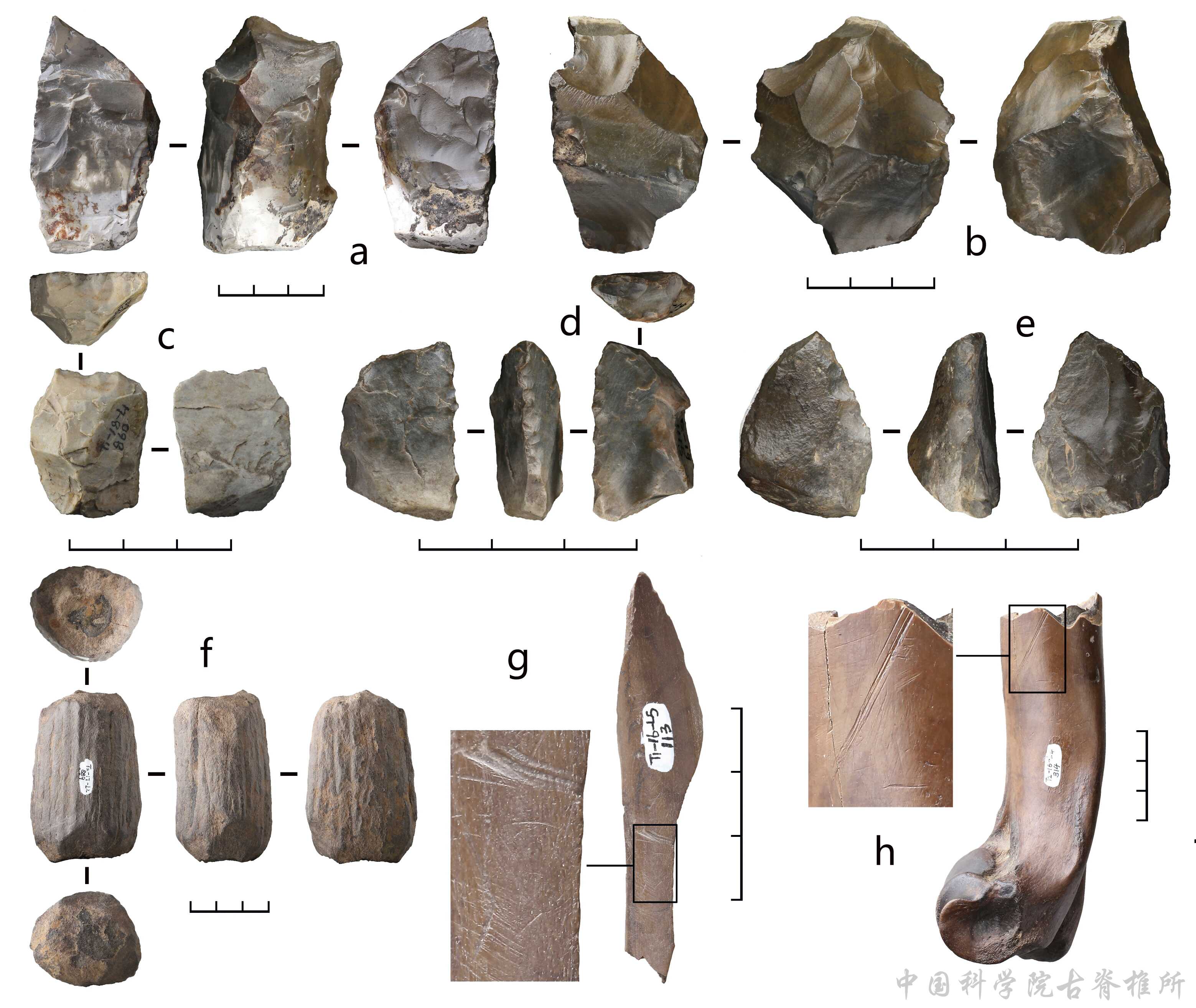 图7 甘棠箐遗址出土的石器、软锤及动物骨骼上的切割痕迹
