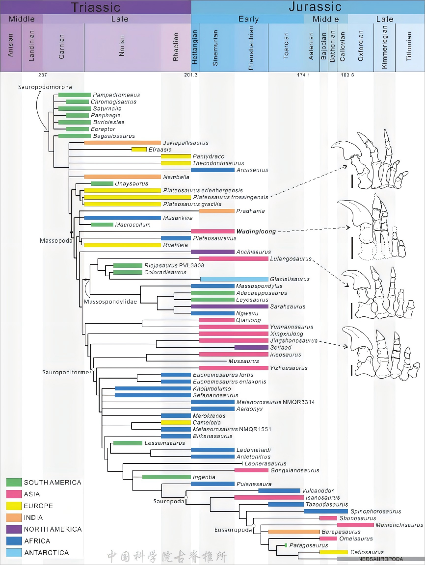 吴氏武定龙是迄今为止在东亚发现的时代最早的蜥脚型类恐龙。和我国已命名的其他早侏罗世蜥脚型类相比,武定龙的体型明显更小。根据头部骨骼和脊椎的愈合状态推测,它应代表一成年个体。同时,其骨骼形态具有一些更“原始”的特征,如牙釉质较光滑、肩胛骨纤细、桡骨和肱骨长度的比例更高、手指较长等。与其他早期分化蜥脚型类属种相比,武定龙前肢的形态特征说明了它更可能是一种两足行走的恐龙。本研究在整合前人工作的基础上,建立了一个全新的系统发育特征矩阵,包含了目前我国所有已知的早期分化蜥脚型类(个别争议属种除外)。系统发育分析结果同样说明武定龙是目前东亚地区最早分化的蜥脚型类。另外,分析结果也支持武定龙与分别发现于南非和德国下三叠统中的Plateosauravus和Ruehleia构成一单系类群,意味着东亚地区的蜥脚型类起源很可能发生在晚三叠世或者是三叠纪-侏罗纪界限附近。
