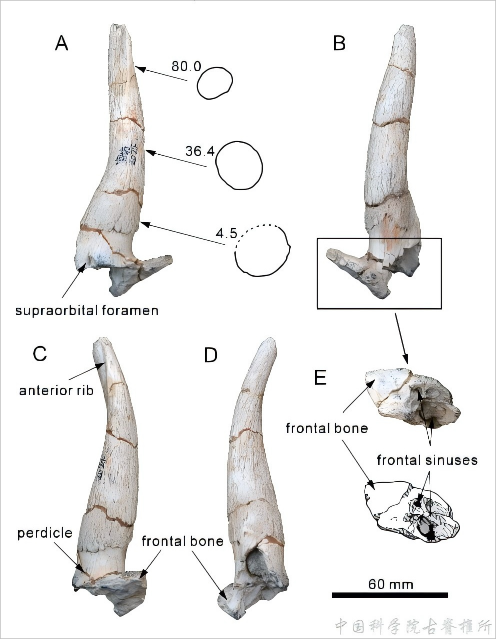 除戈壁羚(Gobiocerus)目前仅发现颊齿化石,高冠羚、土耳其羊和库班羚属已发现一定数量且保存完整的角化石。三属的角心均呈现同向扭转,但扭转程度存在差异,这也是区别三者的重要鉴定特征之一。产自刺滩地区的化石材料为一枚带有部分额骨的右侧角,角心均匀向上变细,基部横截面呈近圆形;角柄较长,角面相对平滑;其中角心所表现出强烈同向扭转(左侧角心从底部向上顺时针旋转)的形态特征明显区别于扭转程度不超过1/4圈的土耳其羊和轻微扭转的库班羚属。