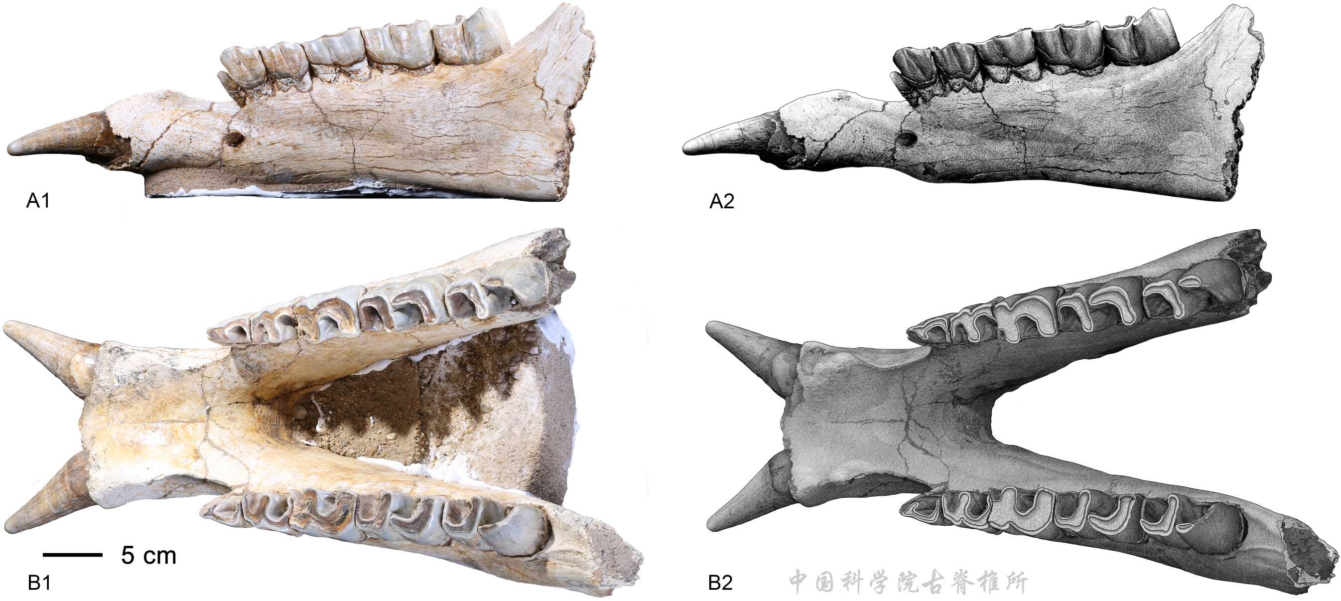 吐鲁番巨犀是巨犀科的一个属,与其他巨犀家族成员相比,该属最为显著的形态特征有两个方面。其一是发育大的下门齿,一对下门齿的齿冠呈八字形向前方延伸,属型种秀丽吐鲁番巨犀(Turpanotherium elegans)的下门齿长度可达5厘米。其二是下前臼齿退化趋势显著,只留下第三和第四下前臼齿具有功能意义。宁夏清水营组新的下颌标本具备这两个方面的特征,因此归入吐鲁番巨犀属。新的标本发育有第二下前臼齿,但其整体轮廓从齿冠到齿根均为柱状,已经失去了典型的下颊齿所具有的齿尖和齿脊,形态极为简单,在上下颌咬合时很难发挥功能意义,显示了该属中的强烈退化趋势。新的下颌标本保存了一对完整的下门齿,其长度约8厘米,超过了秀丽吐鲁番巨犀门齿的测量值,但其下颌和下颊齿明显小于属型种。因此,清水营组的这件具有较长下门齿的下颌可能属于较原始类型的雄性个体。