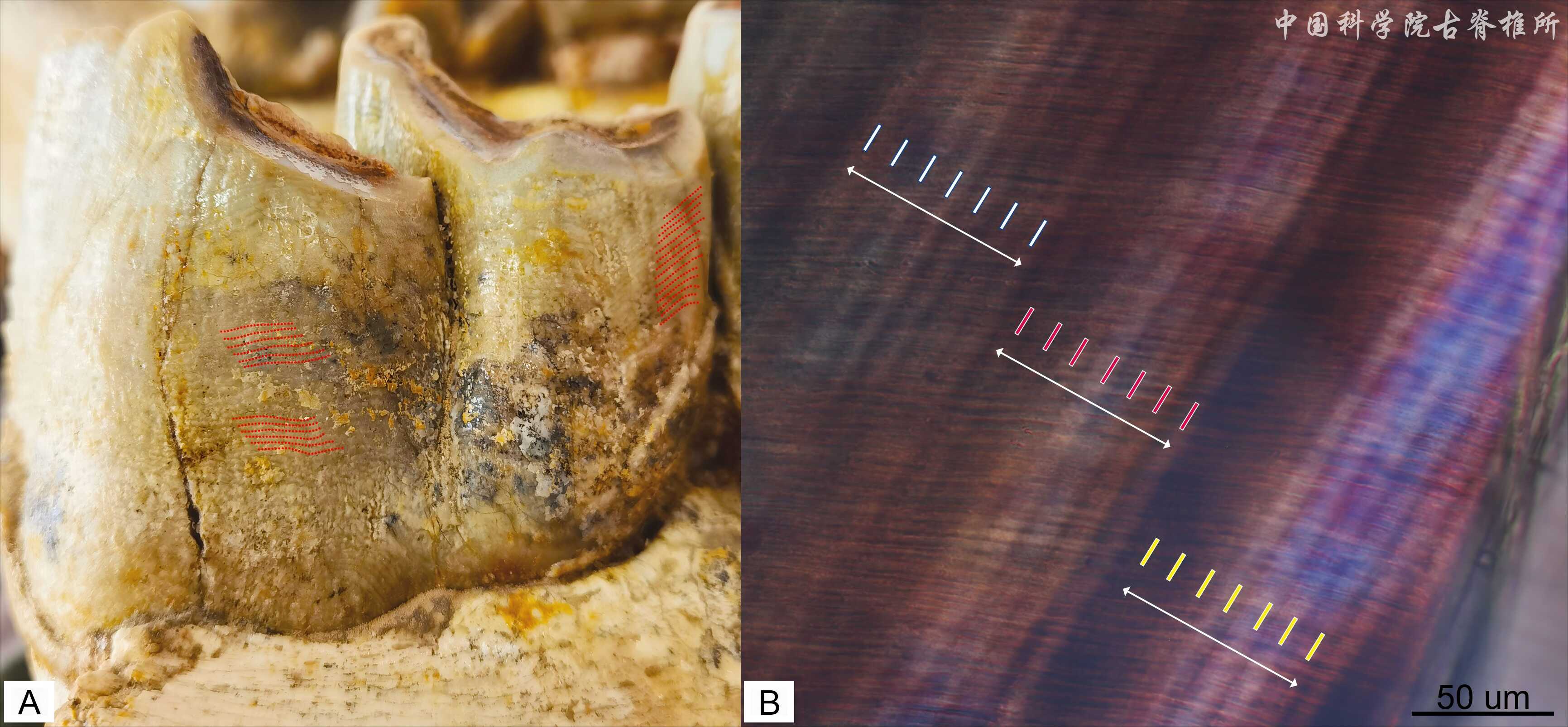 生活史是生物演化的重要研究内容,其与体型大小之间的关系长久以来是研究的难点,受到广泛关注。目前,已知的研究多以现生动物的数据作为参考,对化石类群的研究相当缺乏。例如,现生犀类的体型仅次于大象,寿命可达50岁之久,各方面的生活史数据全面而丰富,但仅有三个化石类群有相关的研究报道。犀类自始新世以来体型变化巨大,巨犀是陆地上曾出现过的体型最大的哺乳动物,化石数量丰富,为研究这一问题提供了契机。该研究团队将邱氏吐鲁番巨犀下颌标本的第二下前臼齿和第一下臼齿制作磨片,结合偏振光显微镜和激光剥蚀的方法观察牙齿上记录的生长纹。