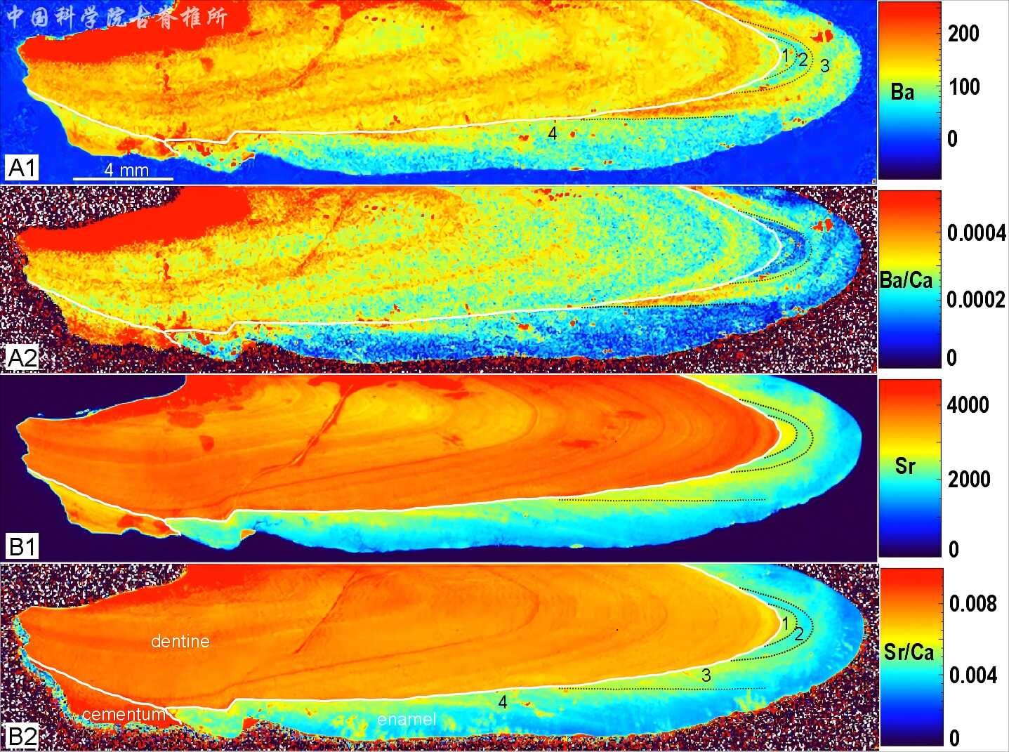 对釉质磨片观察结果显示,邱氏吐鲁番巨犀的每个冠周纹代表7天一个周期。第二下前臼齿至少有61条冠周纹,发育时间至少需要427天。第三下臼齿的齿冠有91条冠周纹,发育时间至少需要637天,与现生印度犀下臼齿的齿冠发育时间接近。清水营下颌的第三下臼齿刚刚开始磨蚀,其年龄代表了该个体的体成熟年龄。根据第一下臼齿和第二下前臼齿的牙骨质年纹数量,推断该个体的年龄约为17岁,即吐鲁番巨犀的体成熟年龄应该在此之前。第二下前臼齿的齿冠在激光剥蚀作用下显示了4个条带区域,具有显著的锶值和钡值变化规律,指示在齿冠发育形成时该个体尚在哺乳期内,哺乳期至少427天。