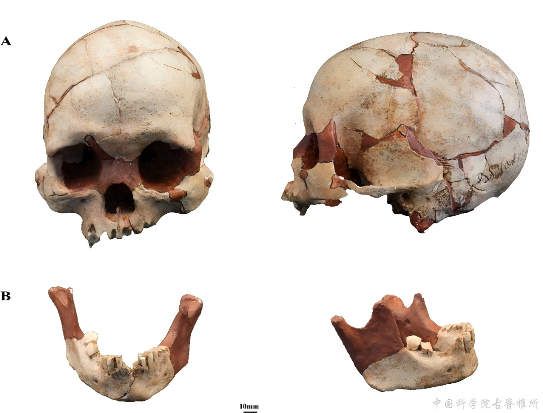 对Yahuai-1头骨及下颌骨形态特征的对比研究显示:该个体呈现出“镶嵌式”形态,其演化位置处于晚更新世人类与全新世现代人之间的过渡阶段。与现代东亚人群颅骨相比,Yahuai-1在部分特征上保留了一定的原始性,具体表现为:颅骨整体尺寸大、颅容量大,颅颌面超级结构(superstructures)发育相对明显。从颅面形状来看,Yahuai-1拥有尺寸较大且具原始性的面部骨骼,其额骨较宽、面部宽阔;同时,其颅骨穹窿较高,体现出较进步的脑颅特征。