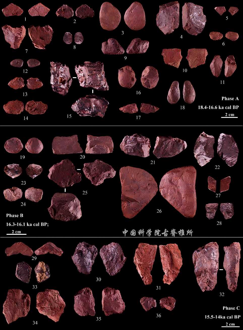 佛洞地遗址位于云南省临沧市耿马傣族佤族自治县,坐落于中缅边境,地处我国与南亚、东南亚的交汇处,生态资源丰富。经放射性碳十四测年确认,该遗址地层序列连续,其主要史前文化层的年代为距今1.84-1.39万年,可划分为三期(从早到晚标记为A、B、C期)。区域内古环境指标显示,人类活动可能受到末次冰盛期(LGM)、Heinrich 1以及BøllingAllerød暖期等气候波动事件的影响。三期文化层中共出土36件赭石标本(图1)和3件赭石加工工具。这是国内首次针对序列性地层中的赭石开展系统全面的分析,并尝试揭示其蕴含的时序性演变规律。